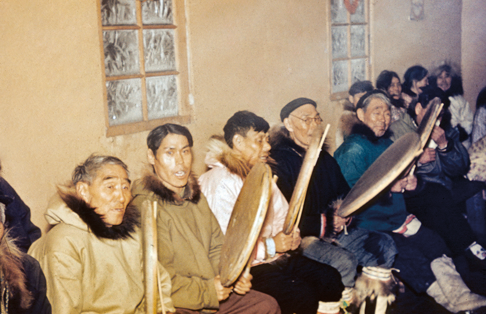 Although they were called the Mackenzie Delta Drummers and Dancers, not all the participants were originally from the Delta area. Some of the drummers I remember were those that immigrated to Canada in the 1940s with several other Iñupiat families from Alaska, notably Alex Gordon and his wife, Hope, as well as Amos Paul and Hope’s brother Daniel (Kapok) Shingatook. It had been a bad year for game in Alaska and they heard the Mackenzie Delta was full of game, fur and fish.