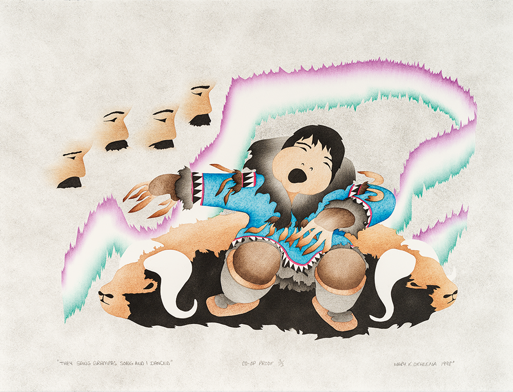 As Inuvialuit, we traditionally passed down our stories through song and dance. People would gather during the dark period of winter, when the sun would not shine for weeks on end, to celebrate their survival through yet another perilous year. It was a time of joy and revelry: the best food was saved for these occasions and old friendships would flare up with laughter and drum dancing. The men would take turns singing songs of their escapades experienced throughout the year with much enjoyment from the community of families. Someone would sing about their frightful encounter with a polar bear and act out the scenes on the dance floor. The shaman would do his dance to summon the caribou spirits for another good year of hunting, while women would dress their families with their best caribou-skin clothing and do their own dances. Living through another treacherous winter was not guaranteed and the drum dance celebration was their reward for making it through.