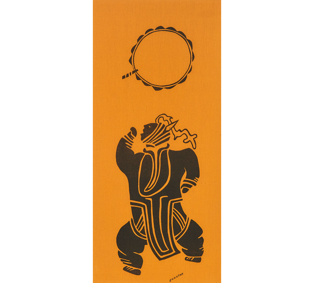 Victor Ekootak Dancing Girl Wearing a Bonnet Trimmed with a Loon’s Beak and a Weasel’s Skin (Nivingajuliat) (n.d.) Silkscreen on burlap 66 × 29.8 cmCOURTESY WADDINGTON’S AUCITONEERS AND APPRAISERS, TORONTO © THE ARTIST