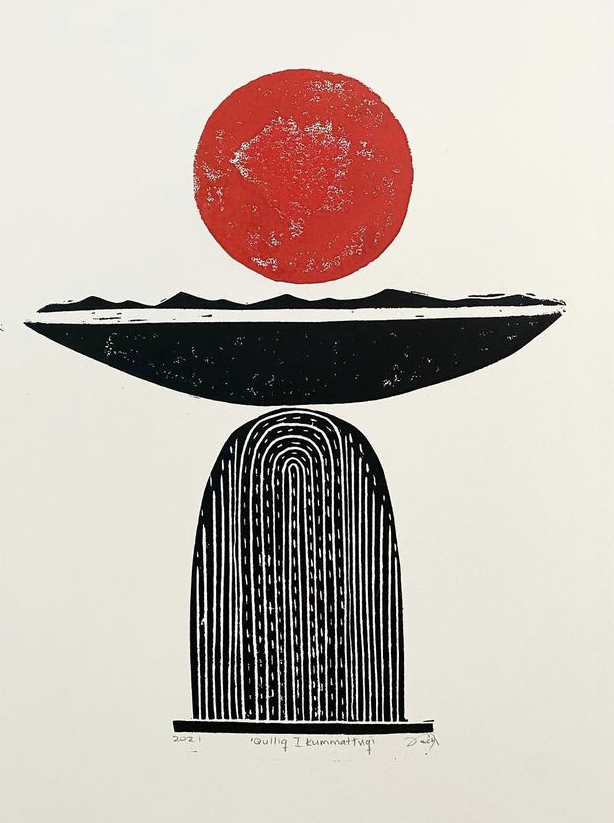 Under the guidance of Kuujjaq, Nunavik, QC-based artist Niap, Allakariallak started exploring linocut printmaking and painting. Her graphic works mirror her jewellery design in their mostly monochromatic colour scheme and repetition of geometric forms. In her 2021 print Qulliq Ikummattuq, a stone lamp is delicately balanced between a pedestal and red sun, echoing the voluptuous form of a woman found in previous works by the artist. “Some of my favourite things to express in my artwork would be the revitalization of traditional Inuit tattoos, my personal experience with motherhood—reflections of how bodies are changing through this experience, and reconnecting with and exploring new ideas based on traditional tools,” Allakariallak states.
