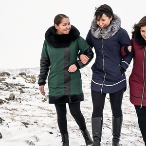 She began her career by learning to sew in high school in a course taught by elders in Iqaluit [1]. Kakuktinniq then immersed herself in traditional garment-making and learned to sew from women in her community [2]. Pursuing her passion, she enrolled in the MC College in Winnipeg, MB, taking Fashion Design and Apparel Production [3]. Kakuktinniq's work is now well known, in particular her unique interpretation of the traditional amauti (women’s parka), which she modernizes by incorporating different materials and design elements such as embroidery. Kakuktinniq has since expanded her range making atigi (parka) for both men and women, using sealskin, fur and modern materials of ripstop nylon and quilted hollofill