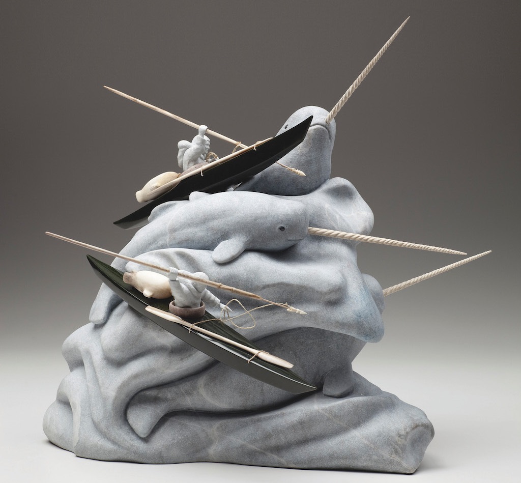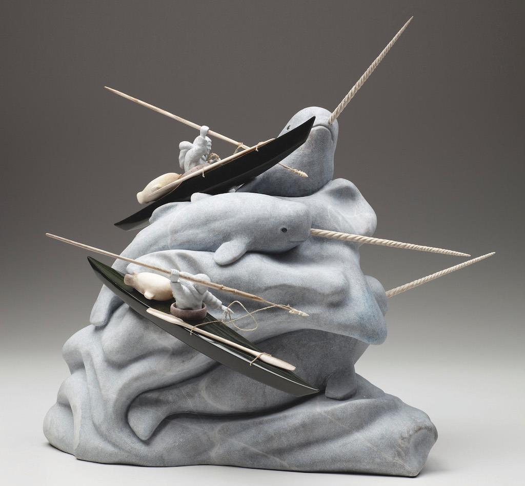 Gauthier creates intricately detailed, mixed-media sculptures with various materials, such as stone, bone, antler, ivory, sinew and baleen (whalebone). His work often depicts traditional Inuit practices, cosmologies, spirituality and personal memories. Gauthier’s carvings also address contemporary challenges that many Inuit families and communities experience across Inuit Nunangat, such as food insecurity, substance abuse, the impacts of environmental degradation and concern for the environment and wildlife. The undated Narwhal Hunt exemplifies the artist's practice. Created with anhydrite, serpentine, whalebone, sinew, labradorite, caribou antler and moose antler, it features a number of diminutive hunters amongst a swirling, light grey mass of sculpted waves and walruses. Narwhal Hunt highlights traditional hunting practices as well as the importance of the walrus as a food source for many communities across the North.