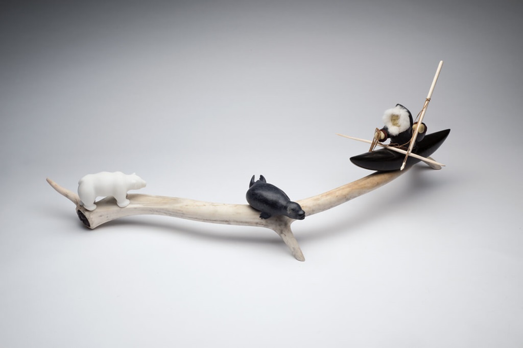 It was in working with stone that his relationship to carving flourished [4], allowing him to expand his practice and refine his skills. Pottle’s relationship to the land, in maintaining a traditional lifestyle of fishing and hunting, influences his art practice. He is able to obtain materials such as hide and bone, and he carves his interactions with animals from memory [5]. Rather than working from images such as photographs, or journals or books, Pottle’s images reside as memories from his time on the land, transferring to an immediacy of time in his sculptural work.