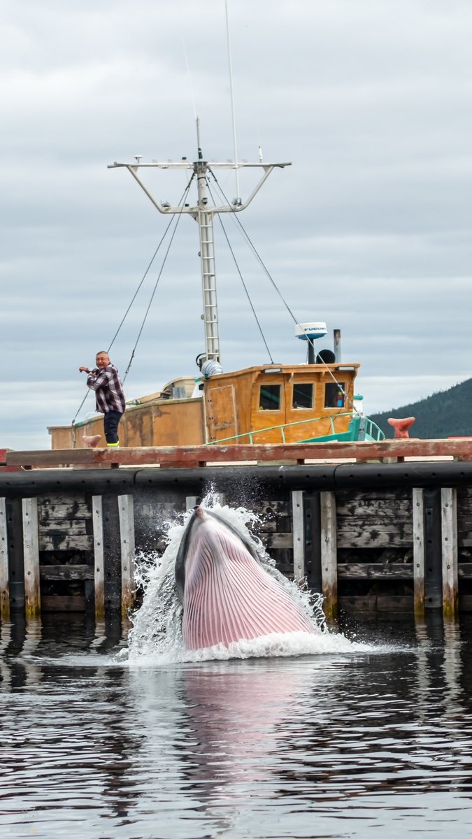 Allen’s work gained national and international attention when he posted a photo series of a grumpus (minke) whale feeding off the Rigolet wharf on his social media accounts. In the most prominent photo, an onlooker on the wharf jumps back from the whale’s spray, showing how close the grumpus has come to feed. The whale’s pink underbelly is a vibrant flash juxtaposed against the gray sky and water, while the orange and green hull of another assiduous hunter, a fishing boat, crouches in the background. Allen’s photo series illustrates the close, but sometimes hidden connections of the Rigolet food chain.