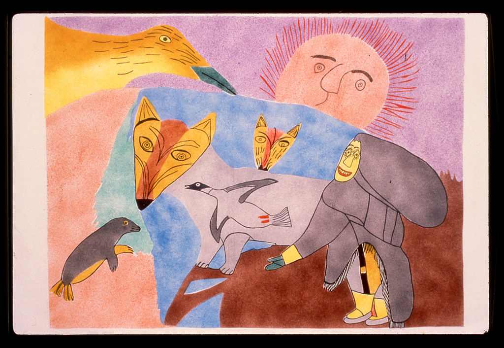 In They All Want the Seal (1988), Oklaga’s bold colour use is on full display, with colours and figures bursting in and out of the edges of the page. By omitting outlines on the background, Oklaga uses only colour to delineate purple sky from brown land and blue water. The minute outlines on certain faces reveal them to be focal points, a common feature of Oklaga’s other works. Here, the setting sun peers over the horizon as the foxes and human engage in a stand-off with the viewer for control of the small seal.