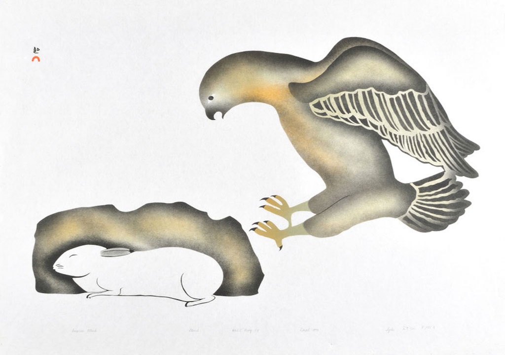 Kingwatsiak’s artwork is in many public collections across North America, such as the Museum of Modern Art, New York, the National Gallery of Canada, Ottawa and the Winnipeg Art Gallery. In addition to being one of the first printmakers in Kinngait, he was also one of the first to work with copperplate engraving in 1961. His artwork has been exhibited within galleries across Canada as well as internationally. He was also active in his northern community, including being President of the West Baffin Eskimo Cooperative from 1971 to 1973, as well as serving on numerous community boards and committees [6].