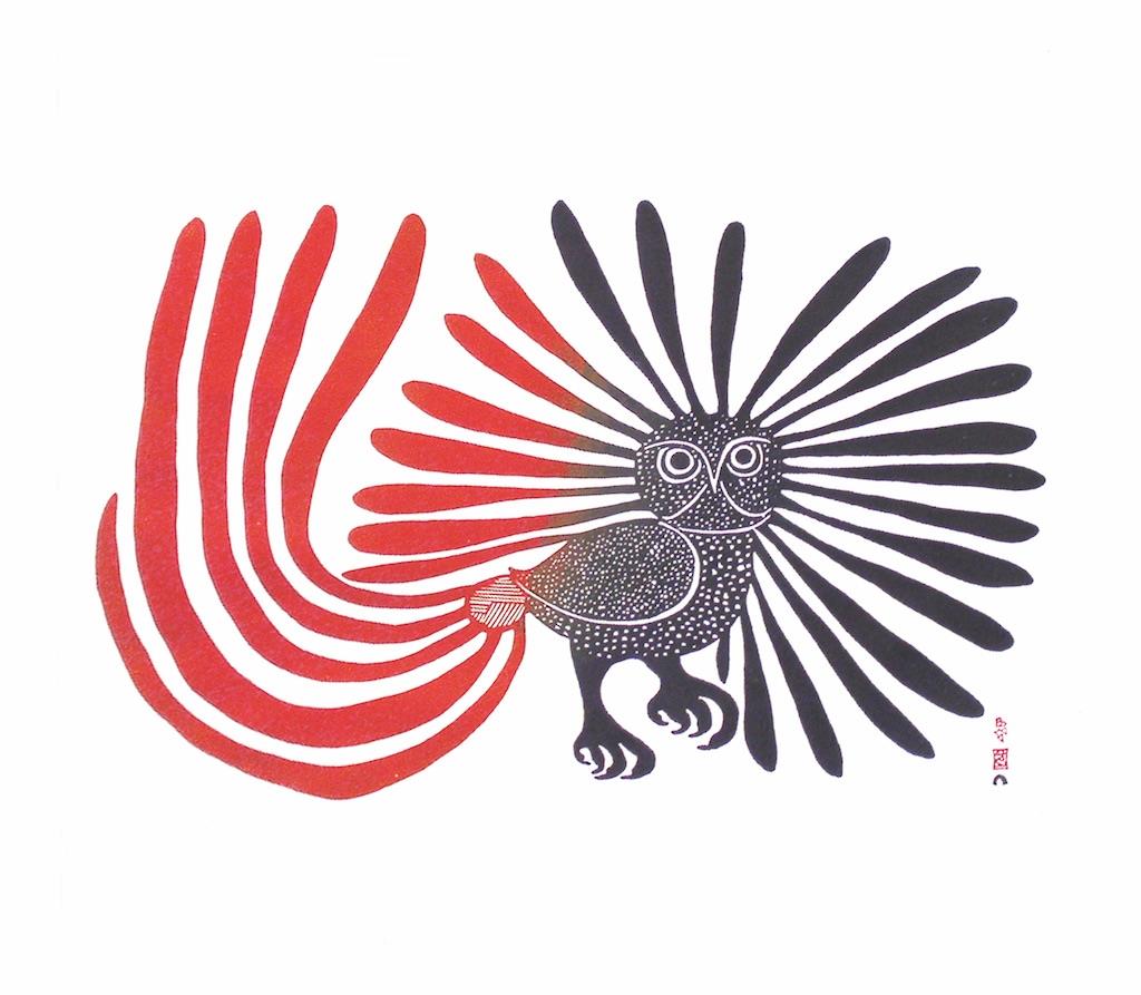 Ashevak worked in carving and drawing but rose to prominence through her graphic works. She portrayed animals, humans and spirits of her surrounding environment, focusing on birds in particular. The Enchanted Owl (1960), one of her earliest and most well-known works, depicts an owl that faces out toward the viewer. The texture of the body is created through dots and lines in black and white. The feathers extend out from the body and surround the bird, and the long red tail feathers reach out and curve upwards. Ashevak created a powerful and captivating image through subtle details. In 1970, The Enchanted Owl was reproduced on a Canada Post stamp; Ashevak was the first Inuk to have her artwork on a stamp [4]. The Enchanted Owl is only the beginning of her vast and diverse output.