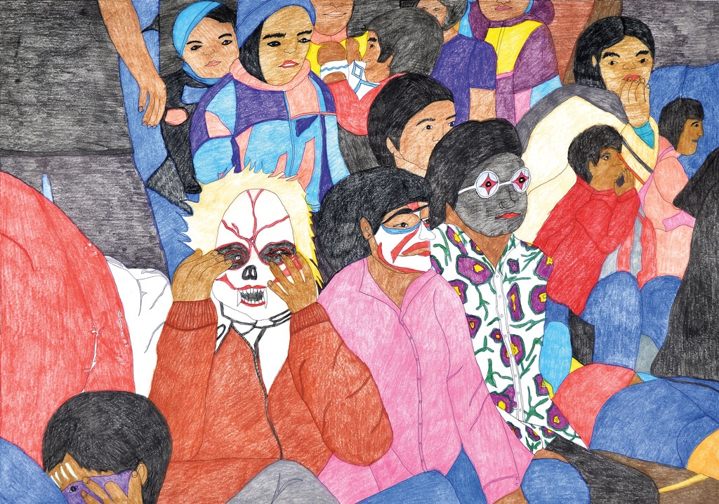 Ashoona’s works are stylistically realistic and rooted in personal experience. Her nostalgic drawings recreate scenes from her collection of photographs, most of which were taken during the 1970s and 1980s [2]. Ashoona’s drawings also document her experiences as a young woman living in Kinngait. In her works, characters watch a duo play electric guitars, enjoy a picnic with soda and chips, go out for trips on the land and visits with people inside their homes. Cultural influences from the South appear in her works, particularly in the fashion. In one instance, a young child sports a Toronto Maple Leafs jersey. Although her works largely depict leisure activities and community gatherings, painful memories are also poignantly recorded by Ashoona’s hand. Many of her works are untitled, leaving the viewer to speculate about the people and places depicted in the images, and juxtapose the intimacy of the subject matter with a degree of privacy [3]. Few of her works are assigned specific dates, placing her narrative album within a non-linear history rather than a rigid timeline.
