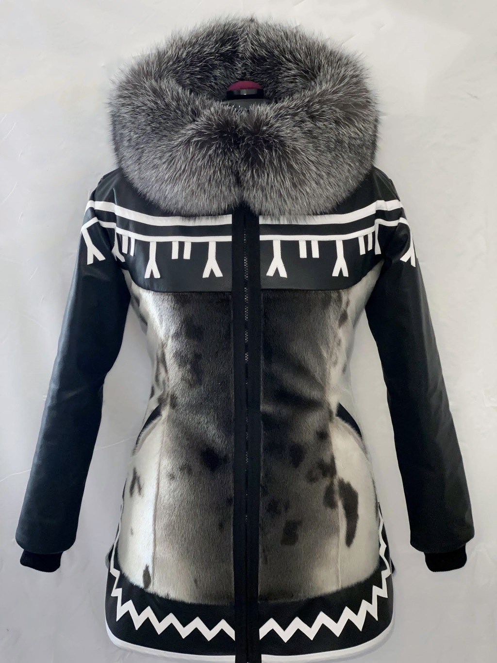 Ningeongan’s designs meld traditional techniques with modern silhouettes and materials—using sealskin, leather, and fur, as well as waterproof commander fabric to create durable parkas, and embellishing them with accents like fringes, florals, ulu designs and tunniit motifs. “Traditionally Inuit women had tunniit tattoos,” Ningeongan explains, speaking about how tunniit have inspired her, “and there is a lot of meaning in those designs.” This application of tunniit patterning to clothing—together with the careful hand-sewing of the leather and sealskin portions of their designs—makes Ujaraatsiaq’s Garments particularly unique. May and Elizabeth Ningeongan work together in a highly collaborative way: brainstorming designs, drafting patterns and sharing the sewing work on different portions of the garments.
