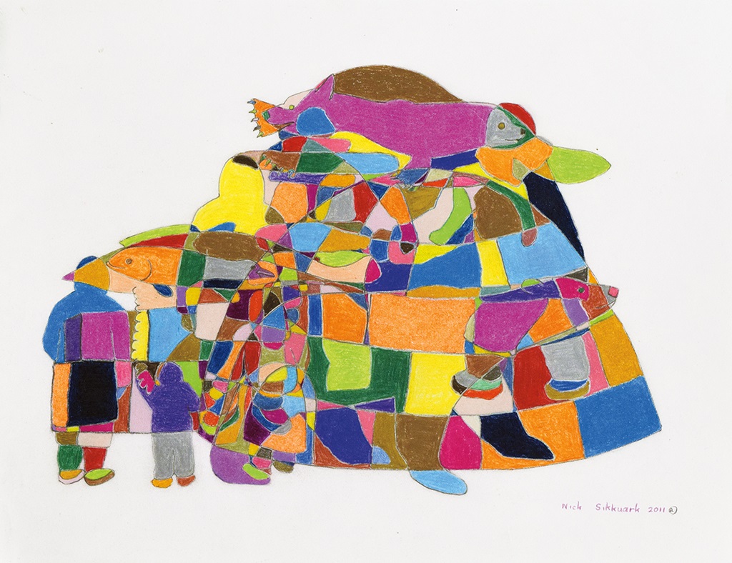 The work Sikkuark produced throughout his career is highly varied but is generally noted for its dynamic perspective and composition and a quality of humour and horror blended together. Sikkuark often featured angakkuit and other traditional spiritual practices in his work but also made works “just from imagination.” [4] With his sculpted pieces, he often stayed very close to the natural state of his materials—arranging mixed-media assemblages of bones and fur with only small holes or textural elements added to create the image. This is visible in Snow Worm (n.d), where a ridged antler with a finely wrought face perches as a worm atop a backwards caribou skull. Other works, like Angatkuk (1991), show a more representational approach to human and animal forms. “I don’t like to make what other people carve,” [5] he said about his original shapes and approach to sculpture. In his later drawings, Sikkuark employed effusive colour and exquisite detail, capturing a realistic landscape with careful shading and peopling it with wriggling spirits or sectioning off items like igloos into abstracted, 2D blocks of colour.