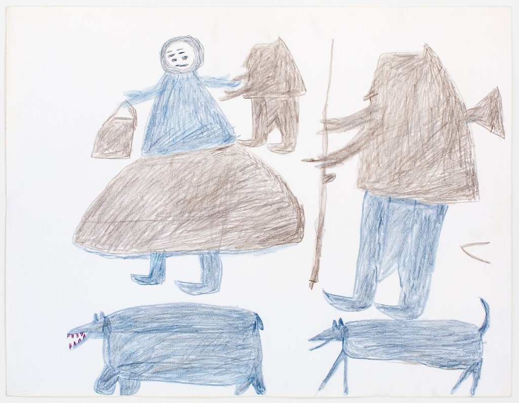 In Untitled (family) (c.1960s) three human figures are depicted including a man carrying a hunting spear and a woman with traditional Inuit tattoos who is holding the hand of a small child. At the bottom of the page are two blue animals, one with sharp purple teeth and a larger mid-section. The human family is drawn in a blocks of blue and brown pencil that is loosely crosshatched. The figures are distinctly human and animal but are also vague and do not seem to be specific individuals. It is as if Parr is recalling a scene from his life but the details are no longer clear, recalling who was there but not how they appeared.