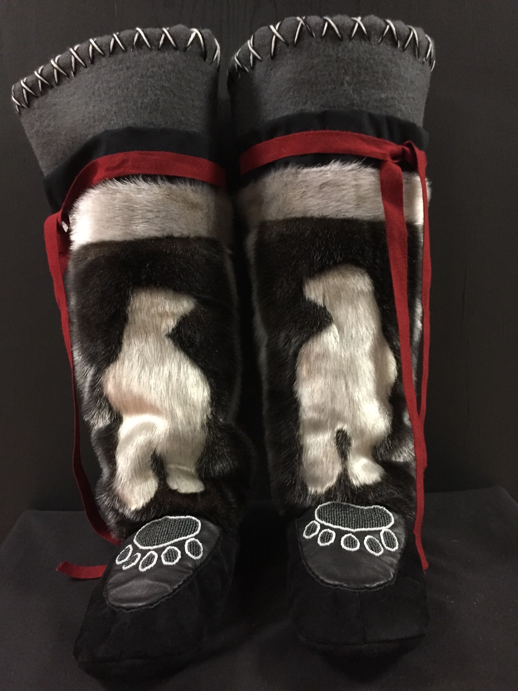 Andersen has made varying types of boots for adults and children, mitts in varying designs in adult and children’s sizes, wallets and purses, as well as garnished sealskin pieces to garments to off-set the look for a more ‘Inuit-inspired’ style. Although her preference is working with sealskin, she is also known to work with leather, moosehide, and duffle, as well as in the art of beading. Although working full-time Andersen also makes time to do some painting on canvas, as well as silk.