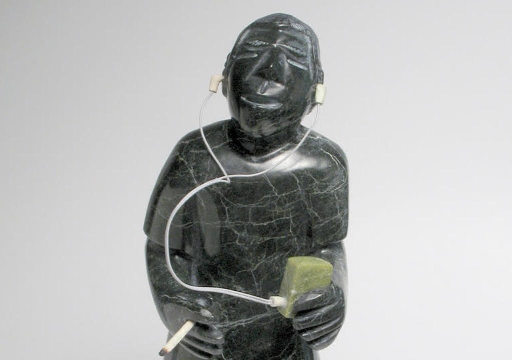 He is also noted for featuring contemporary life and popular culture that blend traditional Inuit carving techniques with new technology [3]. Qimirpik’s Young Man with MP3 Player (2010) illustrates these concepts. This artwork features a young, smiling Inuk man created with polished dark green serpentine stone. Antler earphones and wires are connected to the green MP3 player that he holds. The carving highlights how Qimirpik uses materials that have traditionally been employed by Inuit carvers, but also reflects his personal experience of living in the North today. Young Man with MP3 Player also illustrates how the light colours of technology that Qimirpik features in his work, such as iPods or MP3 players, contrast with the dark, veined stone of the carving.