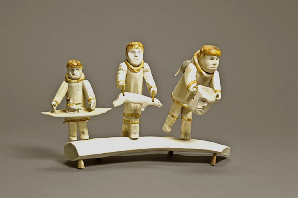 Eekerkik is noted for his use of bone and caribou antler to create his intricate sculptures. His artistic interest in these materials is unique. Sculptors and carvers from Arviat, within the Kivalliq region of Nunavut, are known for using dark, firm and local steatite stone to create their carvings. Eekerkik’s artwork primarily features human or spiritual figures such as shamans, as well as animals from northern environments. For example, Family (1976) is currently located within the Winnipeg Art Gallery’s collection. This pale, caribou antler sculpture includes three figures standing in a line. They are each holding small items, such as a human head, a bear and a figure sitting in a kayak. Each figure additionally wears an amulet on their back, which is believed to offer protection according to shamanic interpretations.