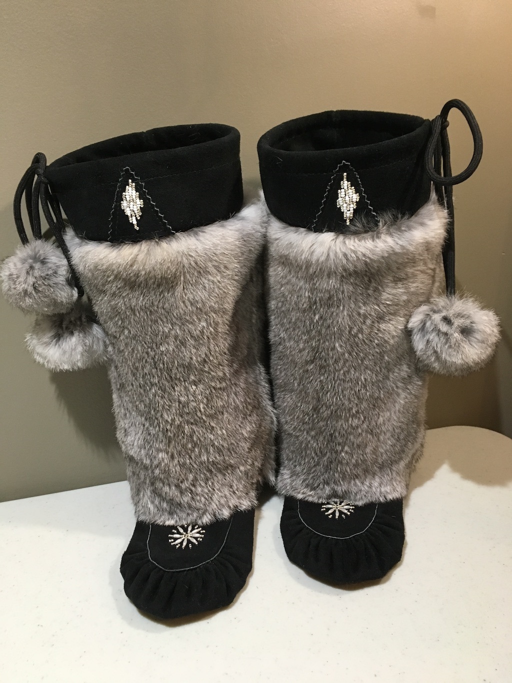 Rideout has been sewing for years. Her mom, Vera Best and grandmother Dulcie Montague and Aunt Jane Gear were her biggest influences in the sewing world. She grew up seeing her mother and grandmother constantly making duffle coats, moose hide and duffle slippers, mukluks and moose hide mitts, canvass coats and knitting a wide variety of items. Rideout started sewing at about the age of 10 with hand sewing little things like throw pillows with people’s names on them. When her own children were small she started knitting and crocheting, then, as her children grew, so did her interest in the traditional crafts. She became interested in slipper making and from there, traditional native mukluks, gauntlets, cuffs and leather/fur hats. Rideout has developed and uses her own pattern when making her mukluks and leather hats.