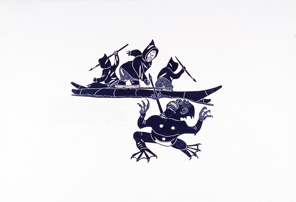 Etok’s works are shaped by a fight for survival. Personal brushes with illness and starvation as well as supernatural monsters from nearby spiritual fonts like the Tuurngait (Torngat) Mountains and the Navvaaq Fjord are some of the subjects of his compelling prints [5]. In Another Story About Ekeagualuk, Etok revisits the legend of a father and his sons who have come to fight a sea monster. The spear, mid-plunge into the breast of the sprawled Ekeagualuk, shows the action of the hunt, while the expression of pain on the spirit’s face and of concentration on the man emotes in characteristic Etok fashion. Etok’s determination to keep old stories and ways of life alive for future generations means that many of his prints feature extended text illuminating the cultural history of what he has depicted. His private print chop displays his own history, the ulu of his mother under the bird darts he fashioned as a child [6].